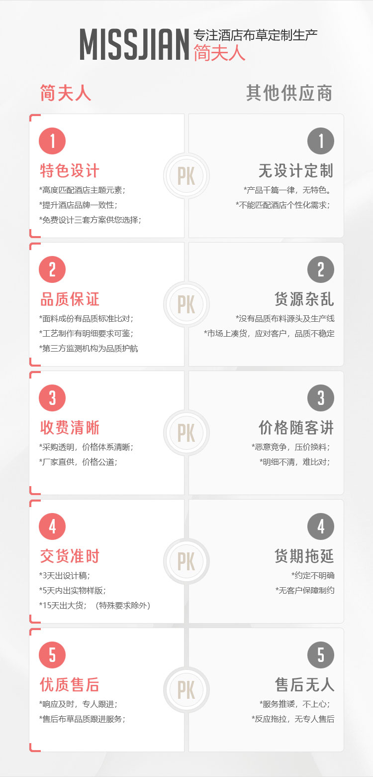 广州简夫人酒店用品有限公司是一家集研发、生产、设计、销售于一体的酒店客房用品企业。旗下拥有 "简夫人 "和 "双暖 "两大线上线下品牌。产品已涉及酒店床上用品、酒店客房配套、酒店卫浴用品、客房设备、酒店清洁用品等多个系列,拥有 15 年的行业生产经验,在酒店用品一站式采购方面有着丰富的经验,为客户提供方便、快捷的采购体验,支持 OEM/ODM,为客户做严格的 QC 控制。
