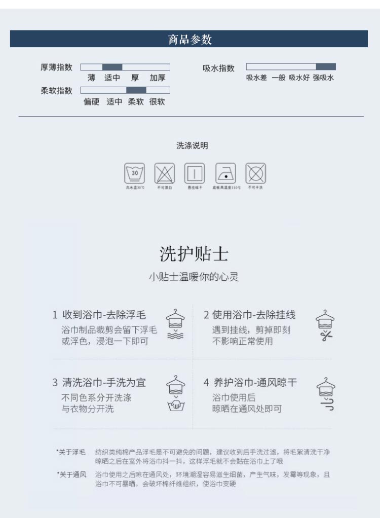 精细毛圈布,均匀柔软亲肤,专为你而设,亲肤柔软,吸湿透气,赋予毛巾产品天然透气,柔软包裹品质卓越,与肌肤直接接触,让人倍感清爽、舒适柔软。双线包边处理,整齐高端,对位精准均衡。