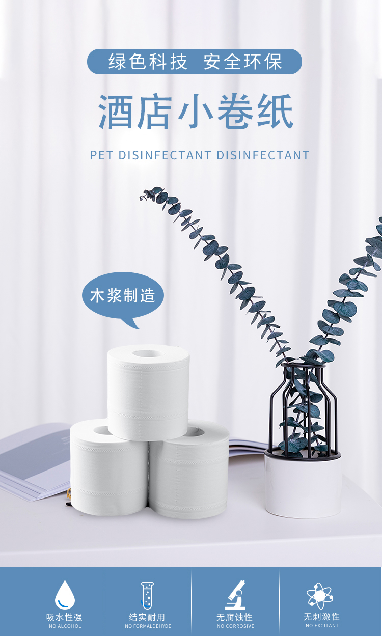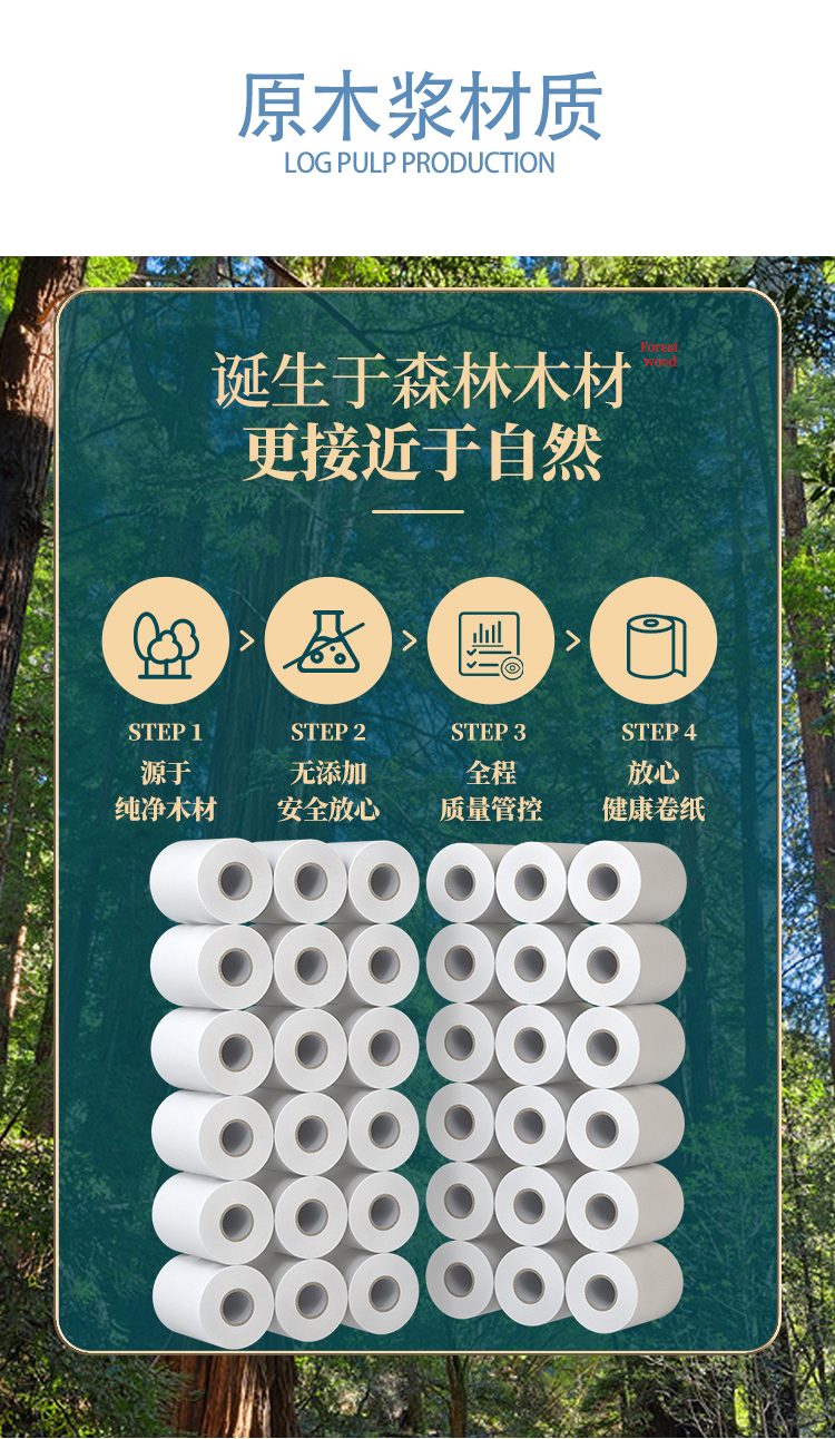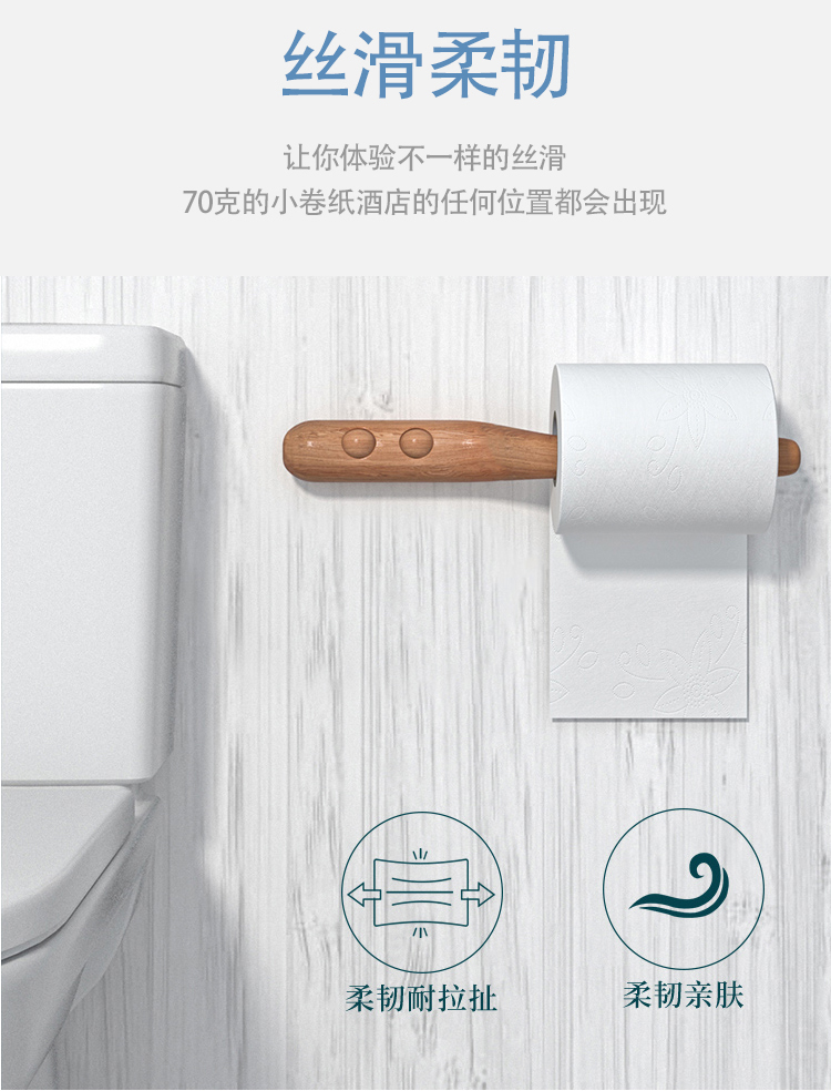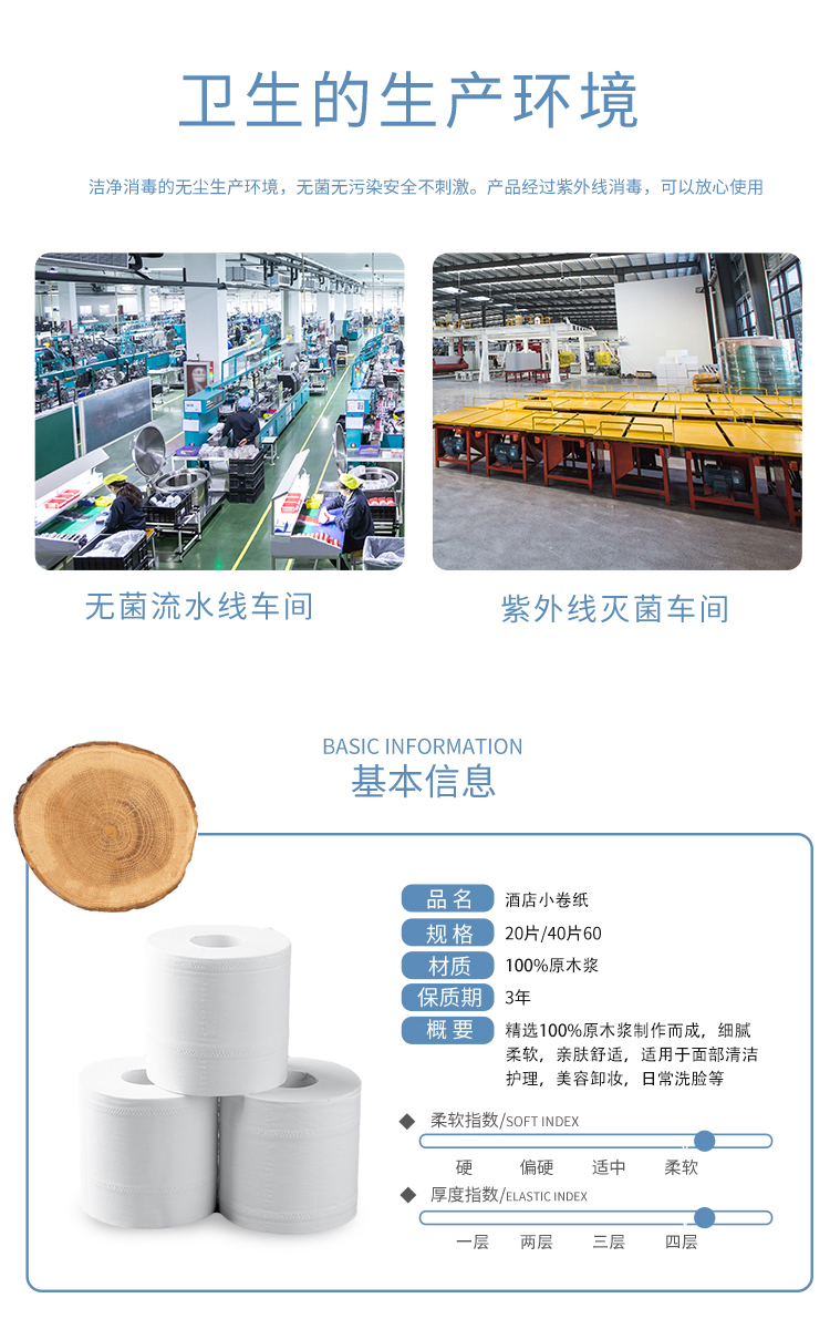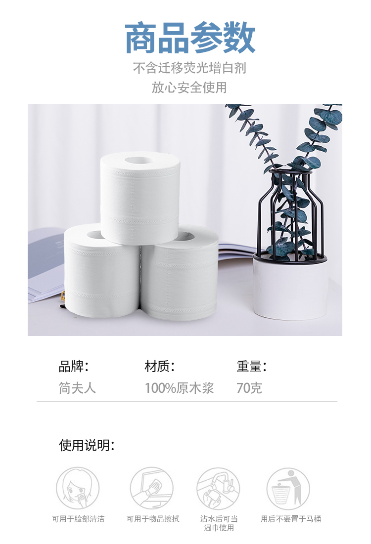 采用优质纯原木纤维而制,经高温处理,更干净卫生,柔软舒适触感,不含迁移荧光增白剂,放心安全使用。双边压花,层层紧凑,1mm点断设计,轻松撕纸不分层。